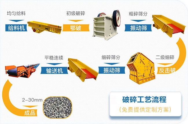 振動(dòng)給料機(jī)GZD1100×4200,1臺(tái);顎式破碎機(jī)PE750×1060,1臺(tái);歐版反擊破PFW1214Ⅲ,2臺(tái);圓振動(dòng)篩4YZS2160,2臺(tái)。