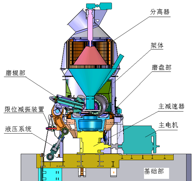 雷蒙磨粉機(jī)主要由:主機(jī)、分析器、風(fēng)機(jī)、成品旋風(fēng)分離器、微粉旋風(fēng)分離器及風(fēng)管組成。其中,主機(jī)又由:機(jī)架、進(jìn)風(fēng)蝸殼、鏟刀、磨輥、磨環(huán)、罩殼等配件組成。