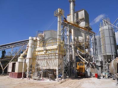 主機電動機通過減速器帶動主軸及轉盤旋轉,轉盤通過柱銷帶動幾十個環(huán)輥在磨環(huán)滾道內滾動并旋轉。大塊物料經錘式破碎機破碎成小顆粒后由提升機送入儲料倉,電磁振動給料機將物料均勻地送到轉盤上部的散料盤上,物料在離心力的作用下散向圓周邊,并落入磨環(huán)的滾道內被環(huán)輥沖壓、磙碾、研磨而粉碎,物料經層粉碎后落入第二層及第三層,高壓離心風機的抽吸作用將外部空氣吸入機內,并將粉碎后的物料帶入選粉機內。選粉機內旋轉的渦輪使粗顆粒物料回落重磨,細粉則隨氣流進入旋風集粉器并由其下部的卸料閥排出即為成品,而帶有少量細粉塵的氣流則經過脈沖除塵器凈化后通過風機和消聲器排出。